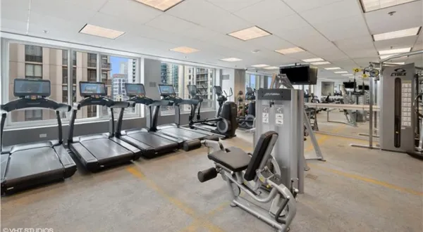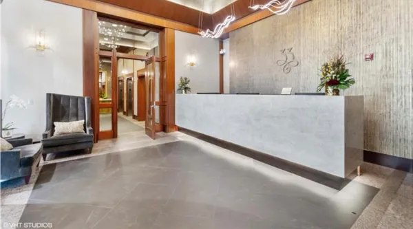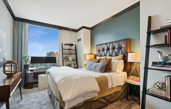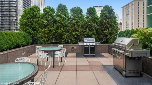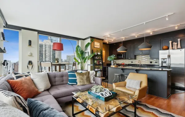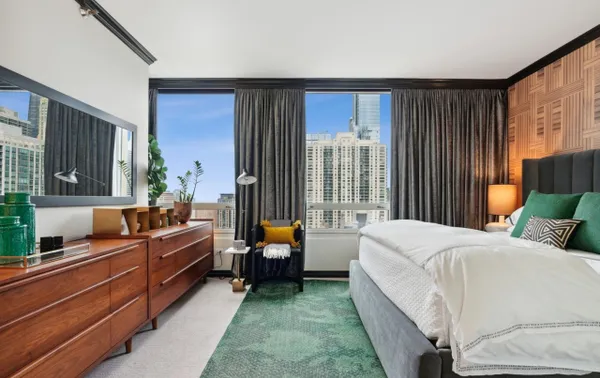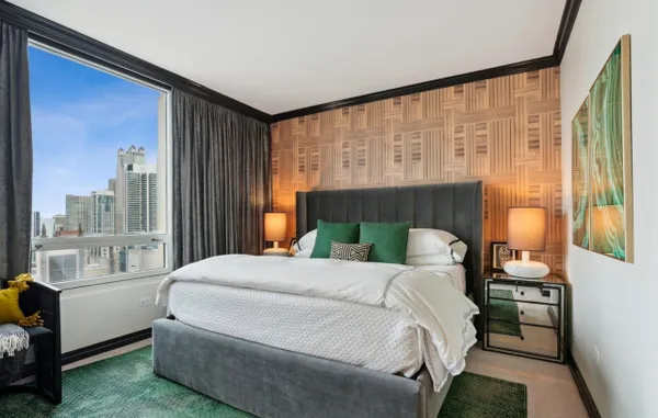 **Photos are from previous listing in 2021.** This beautifully upgraded corner unit offers dramatic skyline, lake, and sunset views. Thoughtfully redesigned by a professional designer, it features crown molding, painted wood trim and doors, backsplash, and dimmable track lighting that creates a warm, moody vibe. The open kitchen includes black cabinetry, granite countertops, a large island and premium Bosch oven range, Bosch microwave, and Miele dishwasher. The spacious primary suite features chic wallpaper, motorized solar shades with blackout rollers, and a glass shower door. Enjoy 9-foot ceilings, in-unit laundry, abundant storage, and a cozy fireplace with stunning west and north exposures. Full-amenity building with 24-hour door staff, fitness center, pool and sundeck with grills, party and conference rooms and package room. Storage cage included; deeded garage parking available for $25,000. Unbeatable River North location-steps from top dining, shopping, nightlife, the Mag Mile, Riverwalk, and CTA.