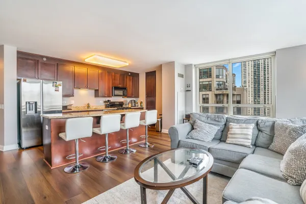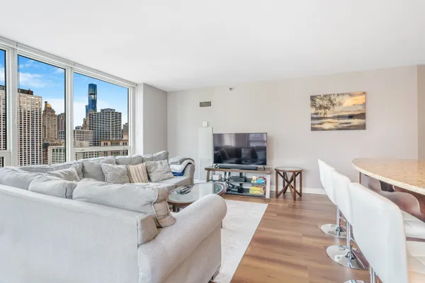 Welcome to your elevated retreat in the heart of River North. This immaculate, 2 bedroom corner residence sits high above the city, offering one of the most sought-after views in the building. Sweeping lake and skyline vistas with all day sunlight and beautiful city views. Inside, the home flows effortlessly with a contemporary open chef's kitchen designed for both everyday living and entertaining. Pristine espresso cabinetry, a generous island with seating, and sleek finishes make this the natural gathering place for friends and family. The smart split-bedroom layout offers exceptional privacy, with two spacious bedrooms ideal for hosting guests or creating a dedicated work-from-home space. Nice sized bathrooms featuring a walk-in shower and a deep 6ft. soaking tub, while in-unit laundry adds everyday convenience. The building delivers true full-service living with a 24hr. door staff, fitness center, outdoor pool and sundeck, party room, conference space, dry cleaning services, and package delivery straight to your door! Everything has been designed to simplify your life and elevate your day-to-day. Step outside and you're instantly immersed in the best of River North: World-class dining, galleries, theaters, shopping along the Magnificent Mile, riverwalk strolls, and easy access to the Loop. Public transportation is right outside your door, and expressways are minutes away, making every corner of Chicago effortlessly accessible. This is city living at its finest.. Sun filled, stylish, and surrounded by the energy that makes River North one of Chicago's most vibrant neighborhoods.