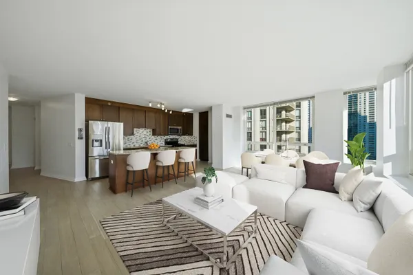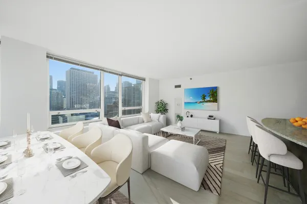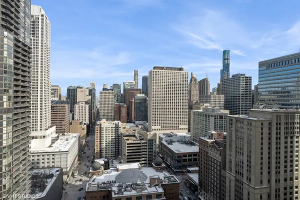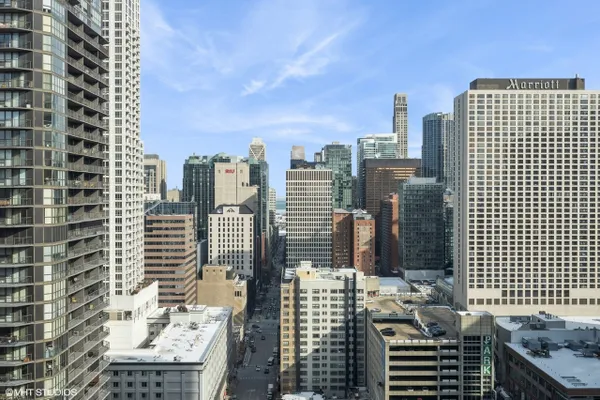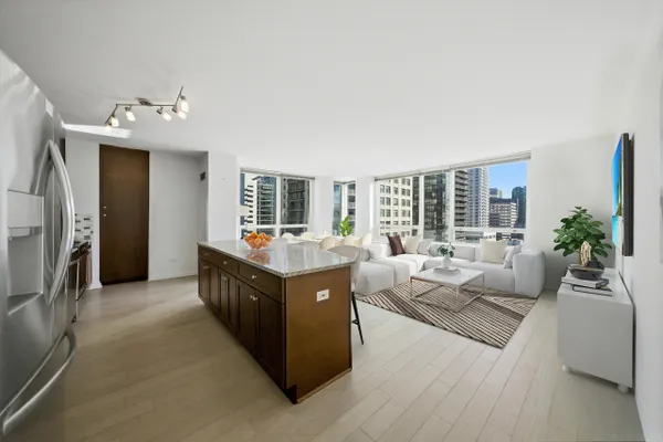 Welcome to Residence 20A, a luxurious corner unit in the prestigious River North neighborhood of downtown Chicago. This exceptional home offers sweeping northeast views, filling the space with natural light and showcasing breathtaking sunrises from nearly every room. Enter through a striking mahogany wood door into a refined granite foyer that sets the tone for the residence. The open-concept kitchen is designed for both style and function, featuring an expansive island, 42-inch wood cabinetry with abundant storage, and premium finishes throughout-perfect for both everyday living and entertaining. The spacious primary suite includes a well-appointed bathroom with double vanity, countertops, and sleek undermount sinks, creating a spa-like retreat. The guest bathroom features a modern stand-up shower, while the guest bedroom enjoys unobstructed eastern views, ideal for capturing stunning sunrises. Additional highlights include an in-unit washer and dryer for everyday convenience. Residents enjoy access to a full-service amenity building offering: Outdoor swimming pool, State-of-the-art fitness center, 24-hour door staff, Media room, On-site storage, and in-unit package delivery. Located just steps from Chicago's finest dining, shopping, and entertainment, this residence offers the best of luxury urban living in one of the city's most vibrant neighborhoods. Monthly assessments include all utilities except electricity. Premium, Indoor Deeded parking for $30,000. Experience elevated city living at Residence 20A.