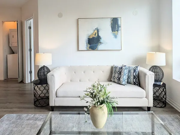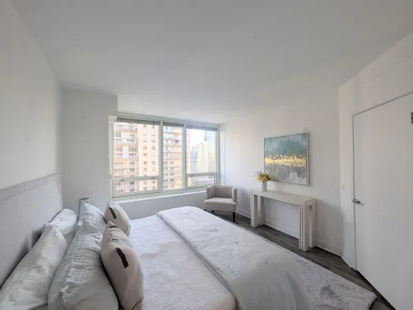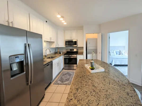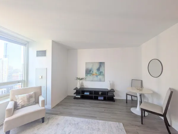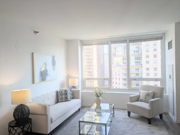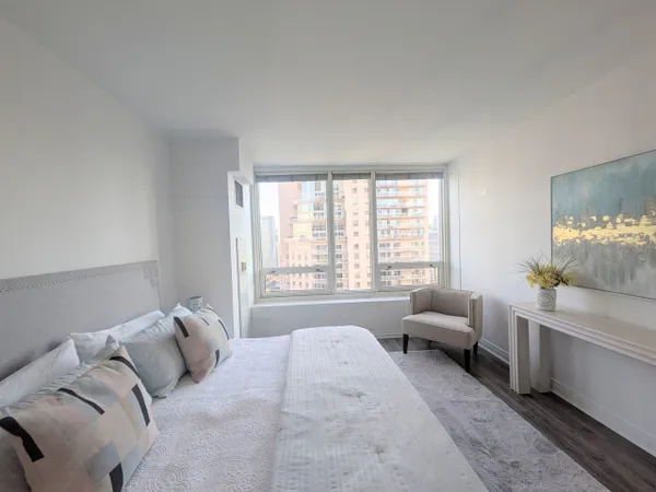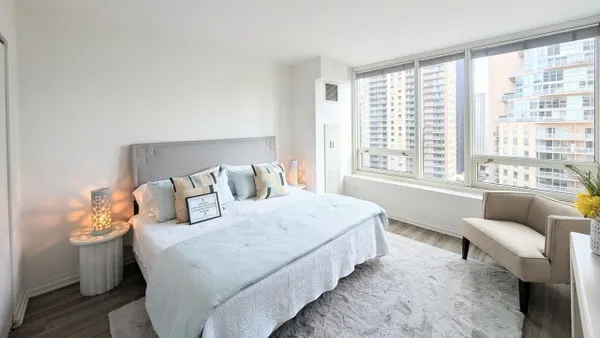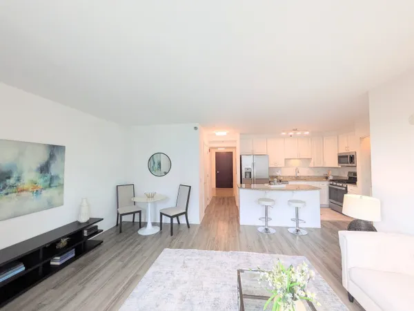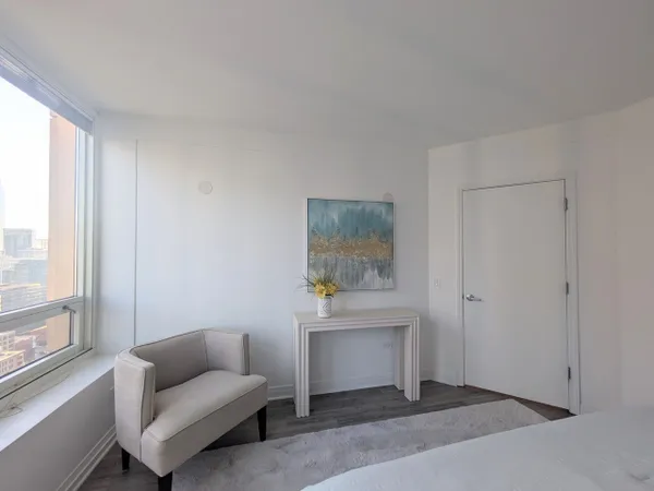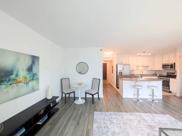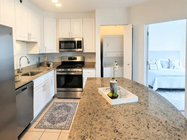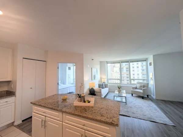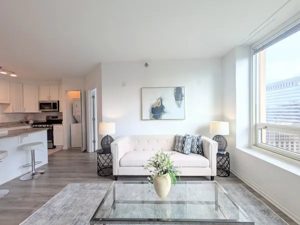 CONTEMPORARY, URBAN 1-BED FOR RENT WITH ALL THE FEATURES YOU WANT...Timeless open kitchen with spacious island bar, stainless steel appliances, 42 inch pristine white cabinets. The generous living room features newer hard surface floors, and plenty of room for an office, Zoom area, and dining table. Tons of natural light and views of the city skyline, with a huge wall of windows. The primary suite features an enormous walk-in closet. In home washer-dryer. Bathroom with soaking tub. Located at 33 W. Ontario, the building offers 24-hour door staff, an outdoor pool and sundeck with grilling area, fitness center, resident lounge, conference room, package receiving, and a storage locker. The location puts you just steps from the Magnificent Mile, Whole Foods, Trader Joe's, and Jewel, with easy access to the Loop, the lakefront, running and bike paths, public transportation, and expressways.